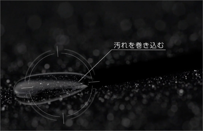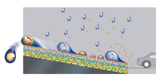 降り注いだ雨粒が汚れを巻き込みながら塗装面を滑落することで、汚れを流していきます。