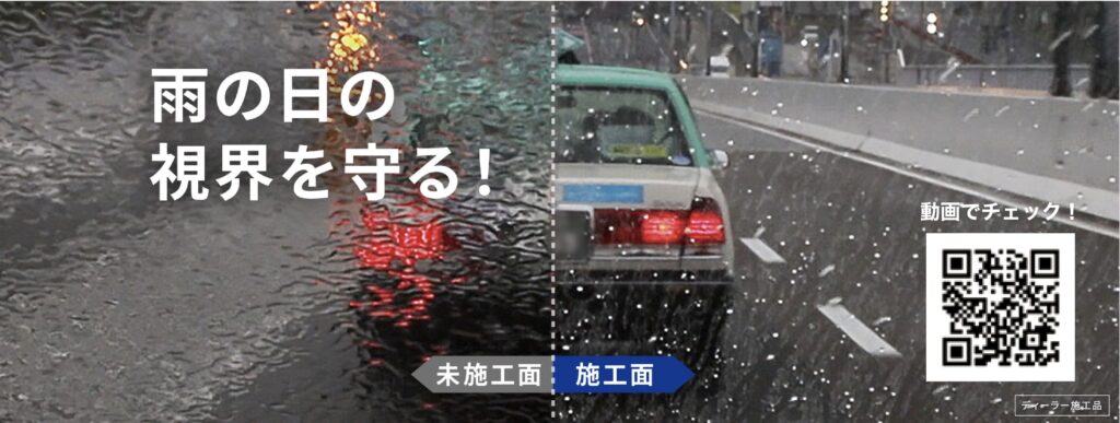※撥水比較画像はテスト走行のためワイパーを作動させていません。実際の走行では必ずワイパーをご使用ください。 ワイパー作動時にビビりが発生することがあります。 撥水シリコンラバーのご使用を推奨します。
