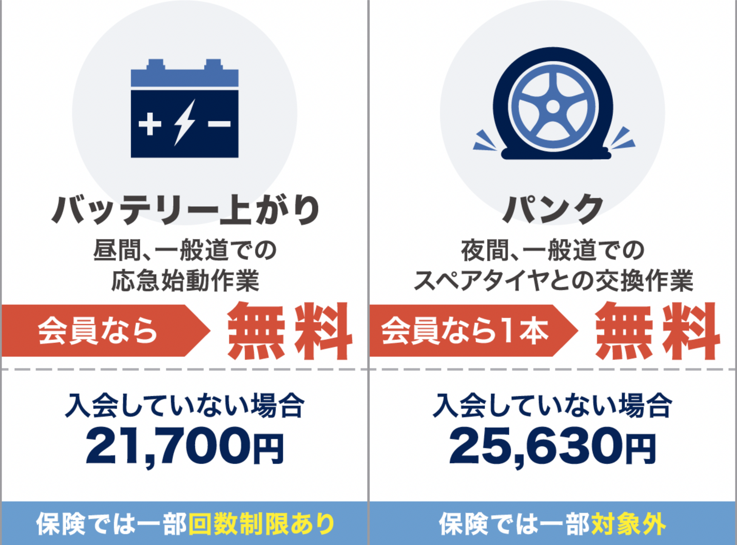 保険は「クルマに」JAFは「人に」かかるサービスです。社用車やレンタカー、お友達のクルマでも運転または同乗中であれば対象。バイクや原付でも使えます。