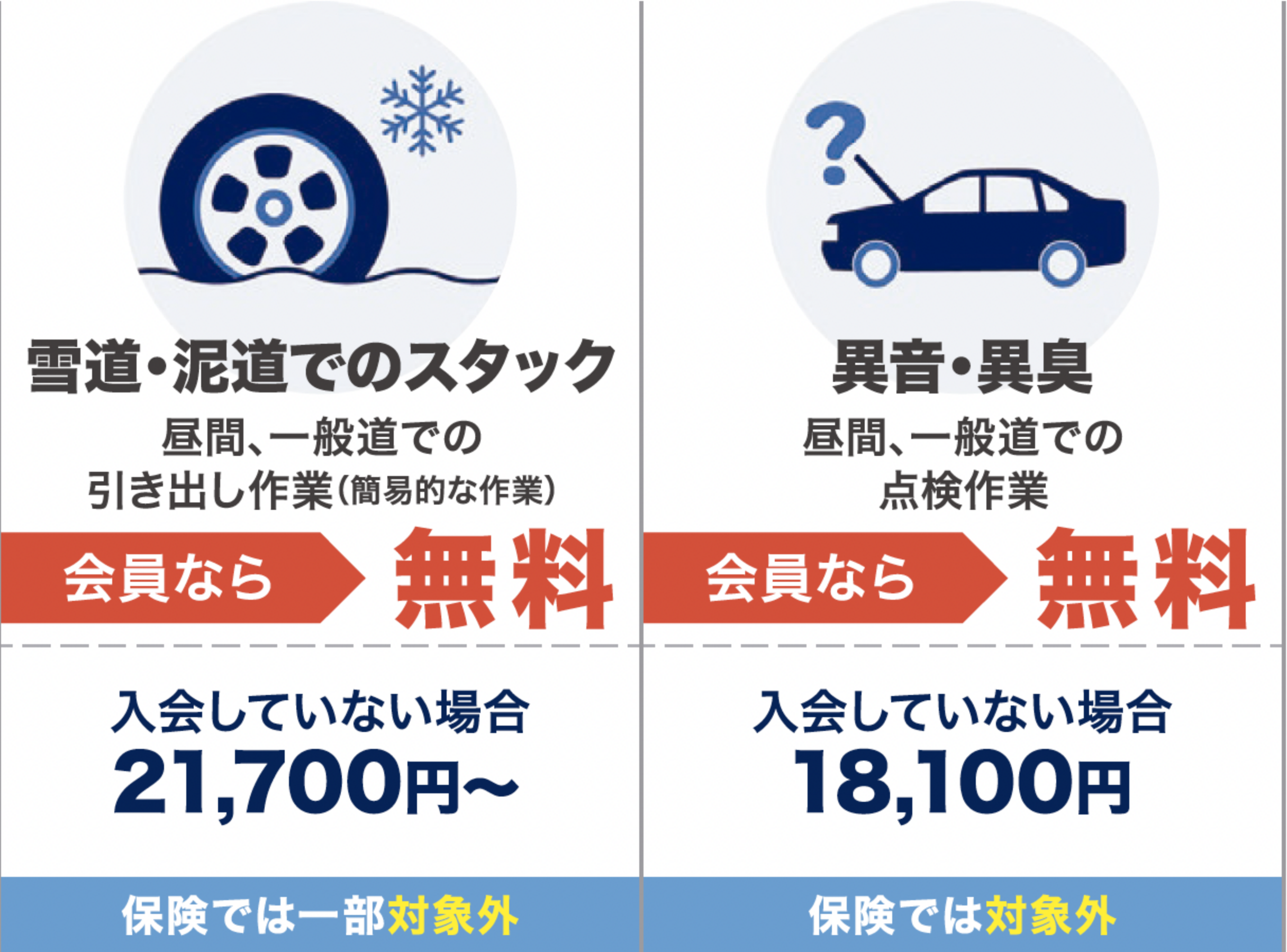 ロードサービスは、会員なら何度使っても原則無料!雪・泥でのスリップや側溝等への落輪などトラブル全般(一部例外あり)に対応します。また場所の制限はなく、自宅や公共の駐車場等私有地内でもOK。