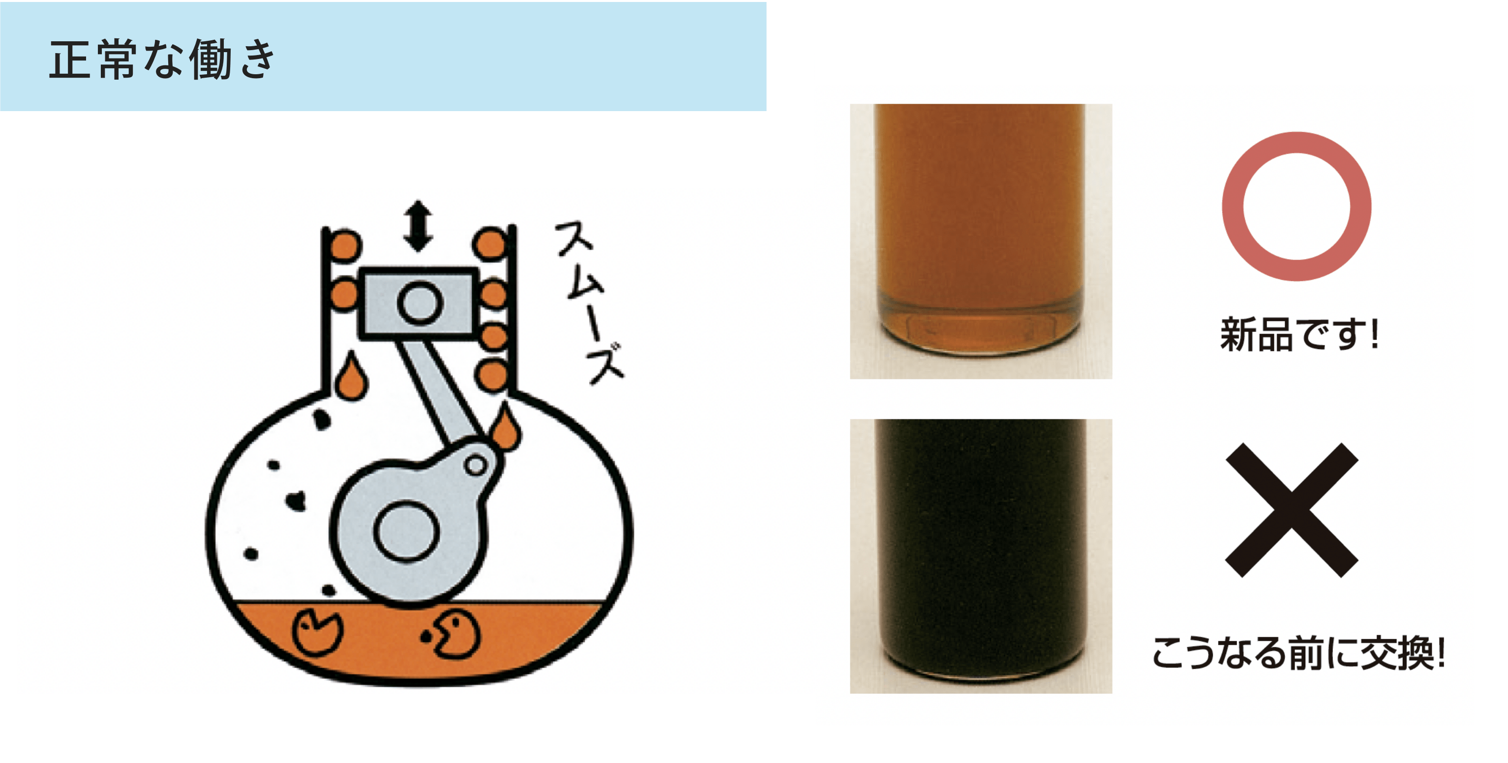 エンジン・オイルが古くなってくると、不純物(鉄粉、燃えカス等)を包み込む力が衰え、エンジン内部の摩擦部分への潤滑が十分にできなくなります。