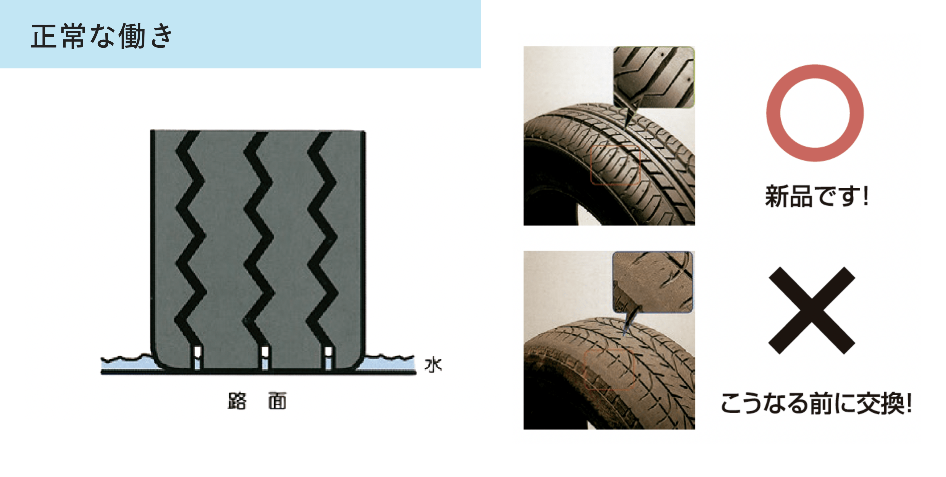 自動車の中でタイヤだけが直接路面と接していて、走行、かじ取り等多くの機能を持っています。特にタイヤの溝は雨天走行時等にタイヤと路面の間にある水をその溝から外へと排出し、タイヤと路面をしっかり接触させる働きがあります。