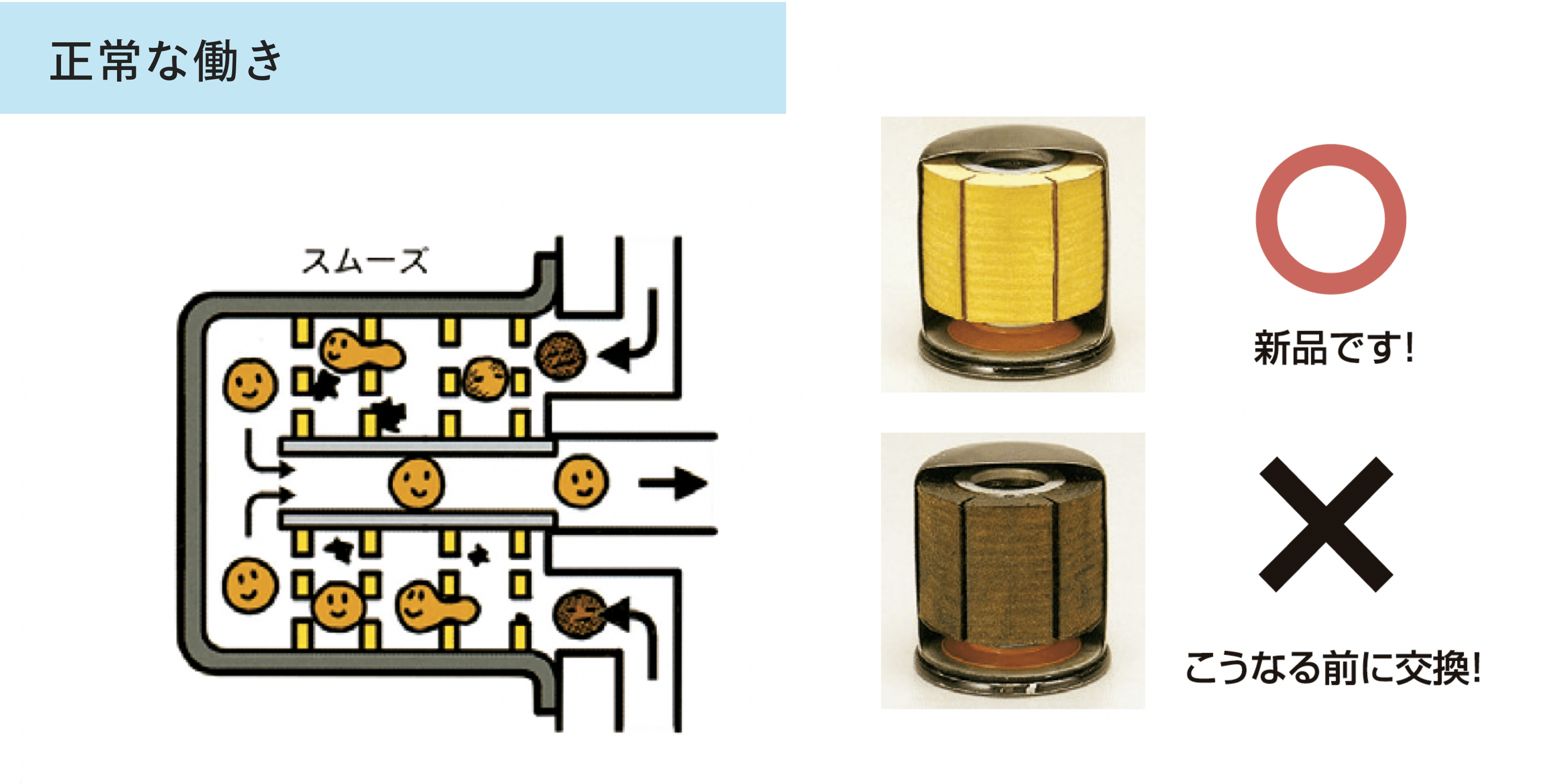 オイル・フィルタは、エンジン・オイルの中の大きな不純物(鉄粉、燃えカス等)をろ過し、エンジン・オイルをきれいにします。