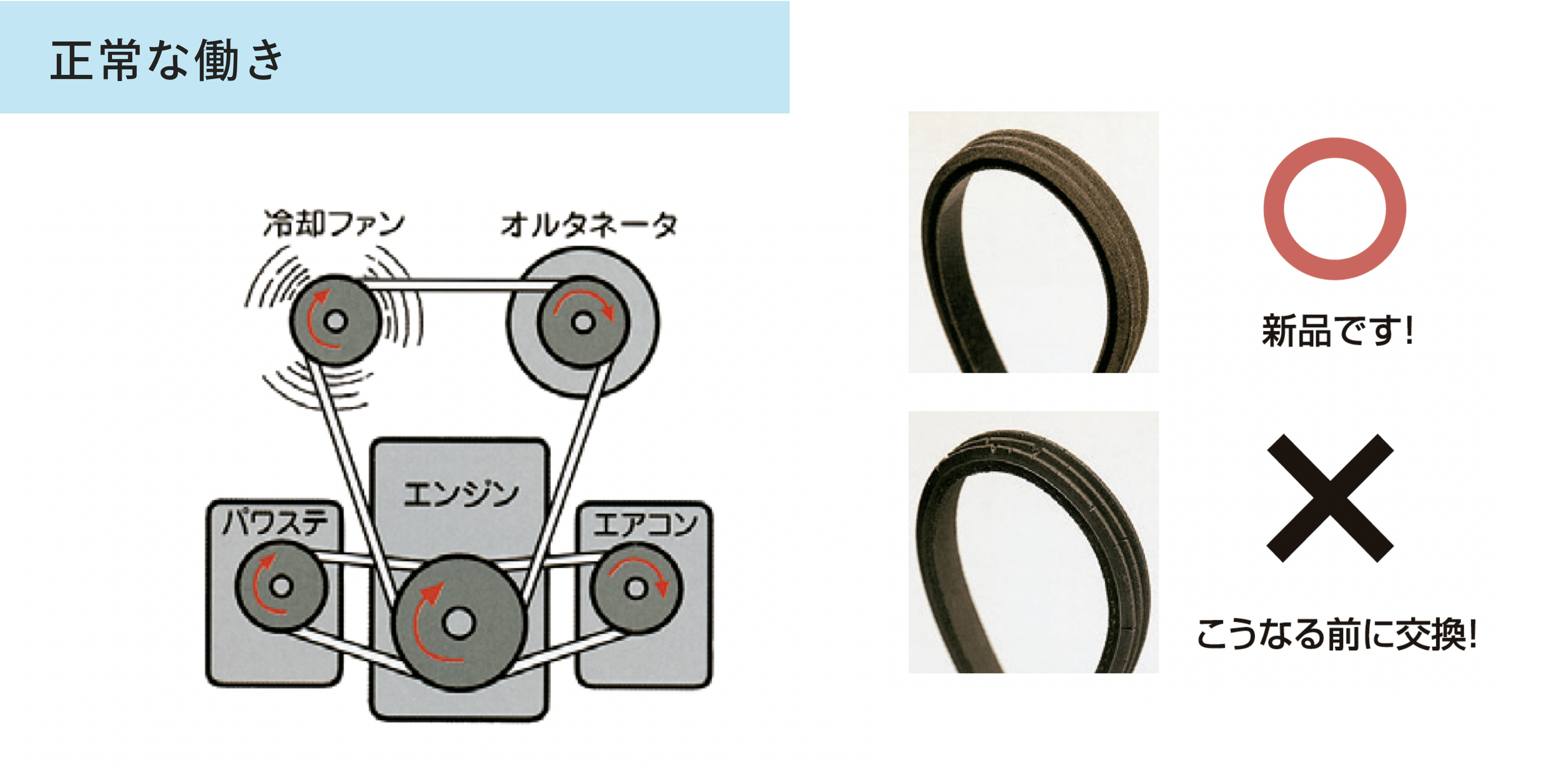 ひび割れ又は伸びている状態で使用し続けるとベルトが切れてしまいます。オルタネータ・ベルトが切れてしまうと、バッテリを充電できなくなりバッテリ上がりを起こし、エンジンが始動できなくなります。