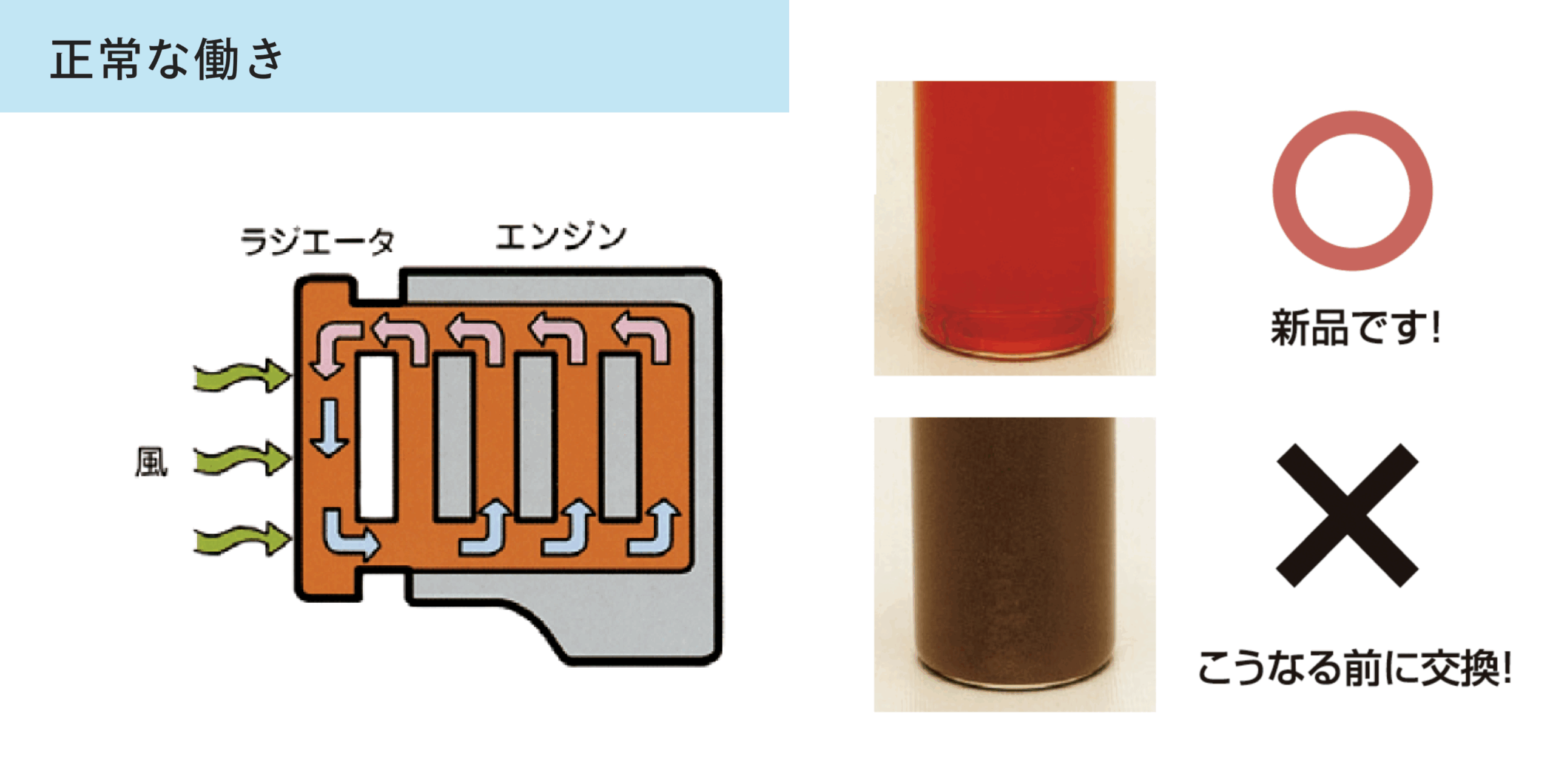 LLC(エンジン冷却水)はエンジン内部を循環し、エンジンで発生した熱を吸収してラジエータで放熱することにより、エンジンを冷却しています。また、冬季の冷却水の凍結によるエンジンやラジエータの破損を防ぐとともに、腐食防止剤により錆や腐食を防止します。