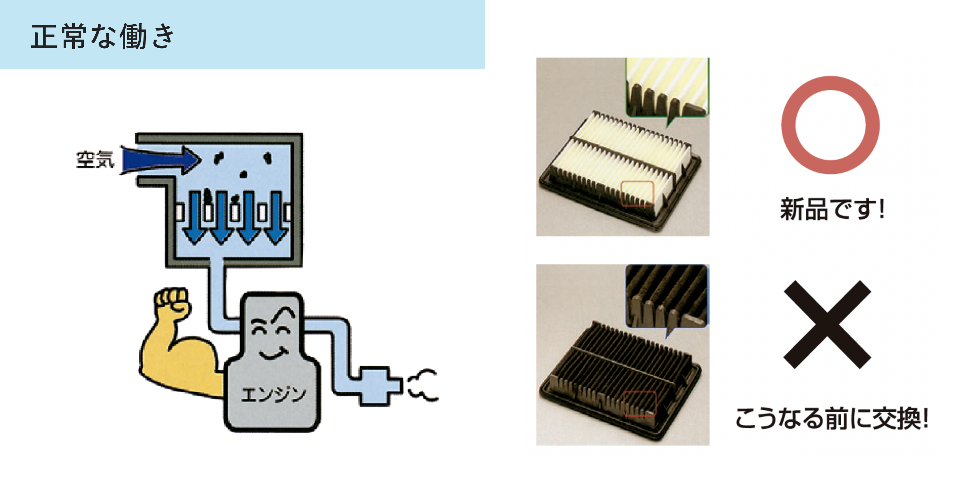 目詰まりを起こし吸入空気量が不足すると、エンジンが力不足になったり、燃費の悪化の原因となるとともに、ディーゼル車では黒煙の排出量も多くなります。