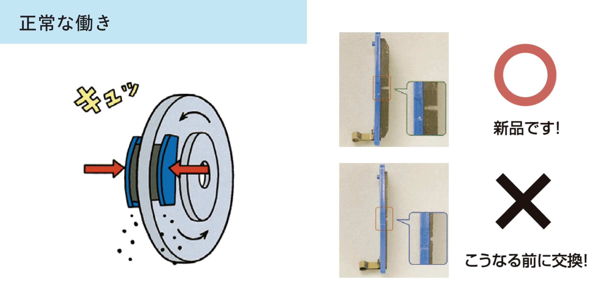 ディスク・ブレーキはブレーキ・パッドで円盤状のディスク・ロータを挟み込むことによる摩擦力によって車を停止させています。ブレーキ・パッドは摩擦材、ディスク・ロータは金属を使用しているので、ブレーキ・パッドの方が早く摩耗します。