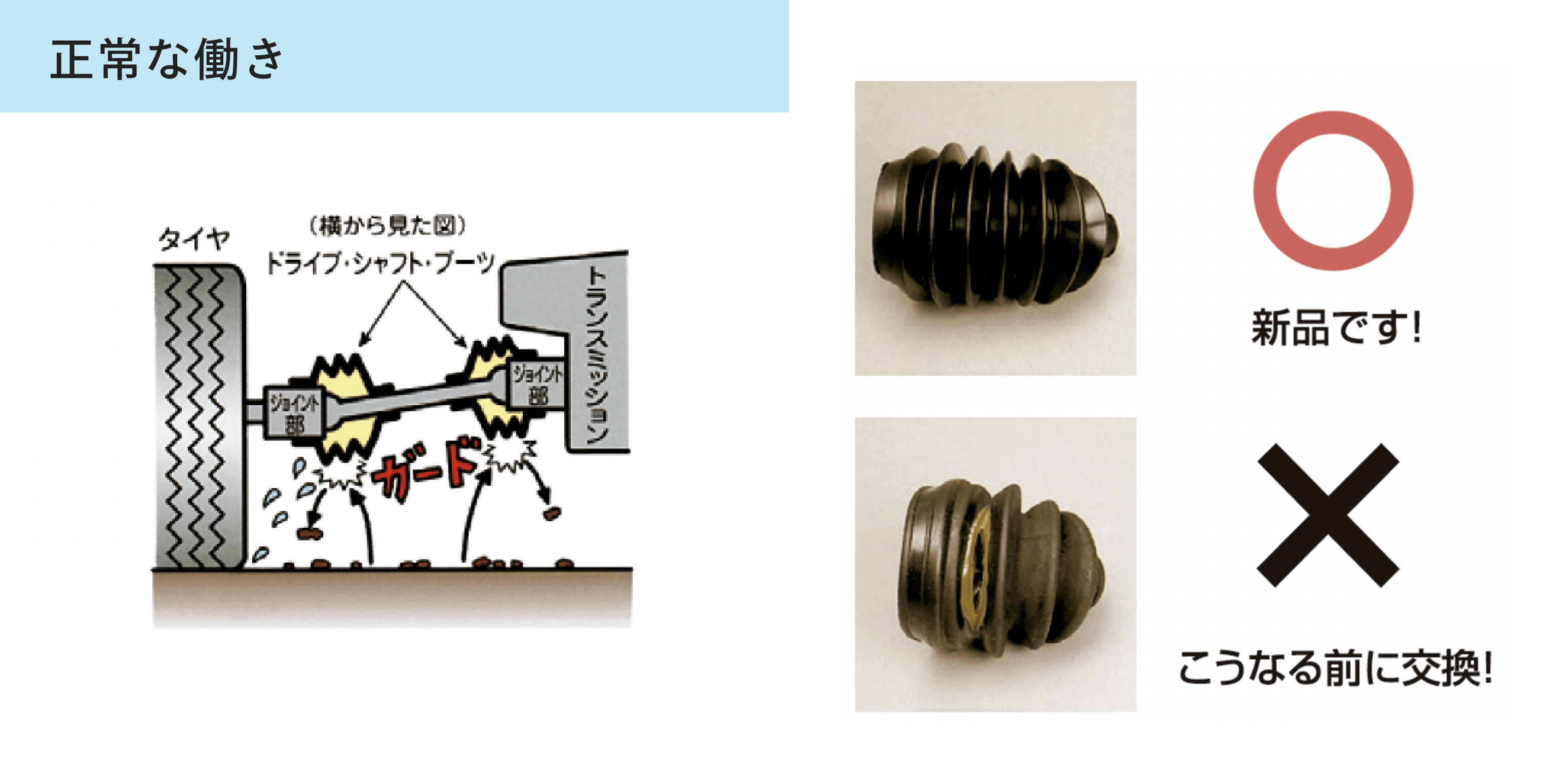 ひび割れ等が発生したまま使用し続けると、気づかないうちにドライブ・シャフト・ブーツに亀裂が発生し、亀裂からグリースが漏れ、また異物(ホコリ、石、水等)がドライブ・シャフトのジョイント部に入り、ベアリングに損傷を与えてしまいます。