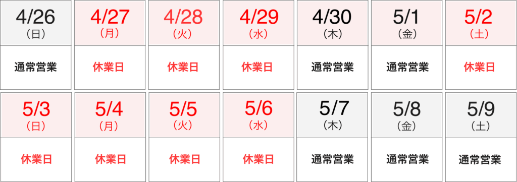 ゴールデンウィーク期間中の営業日につきまして、下記の通りご案内申し上げます。