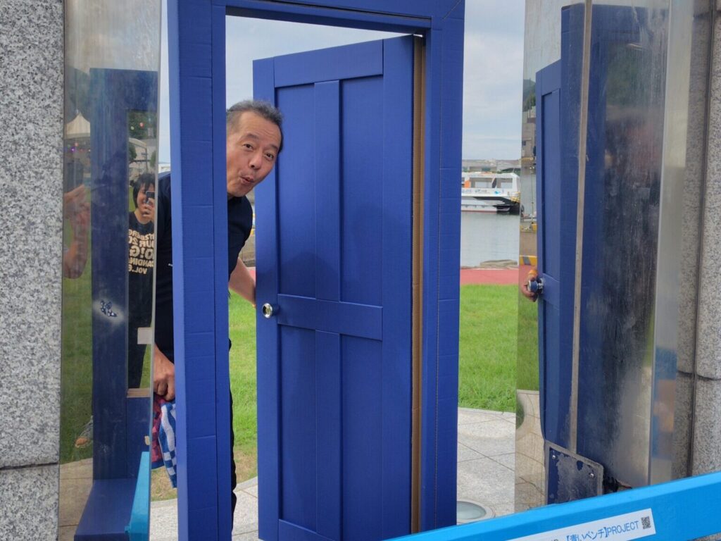 どこでもドアからひょっこりと顔をだす時津町の山上町長です、たのしそ~😆✨ちゃんと掲載許可いただいております😊