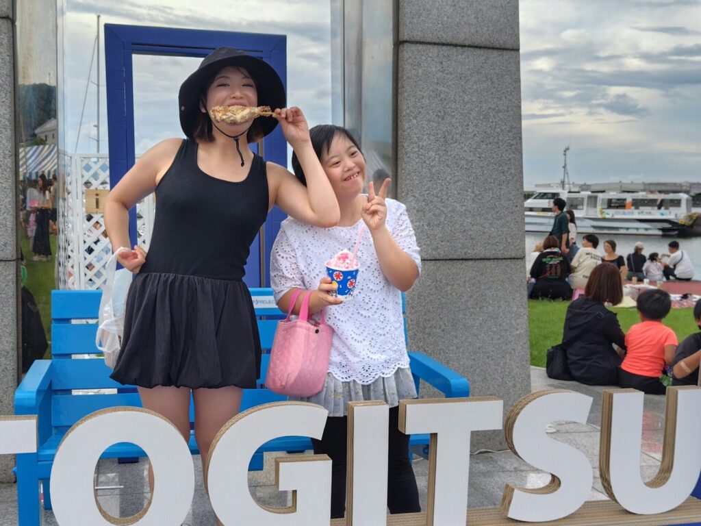 美味しそうにお肉を頬張るこの女性は『私!!時津町大好きなんです!!』とおっしゃってのりのりで青ベンと写真を撮っていました😍😍いいですね~✨