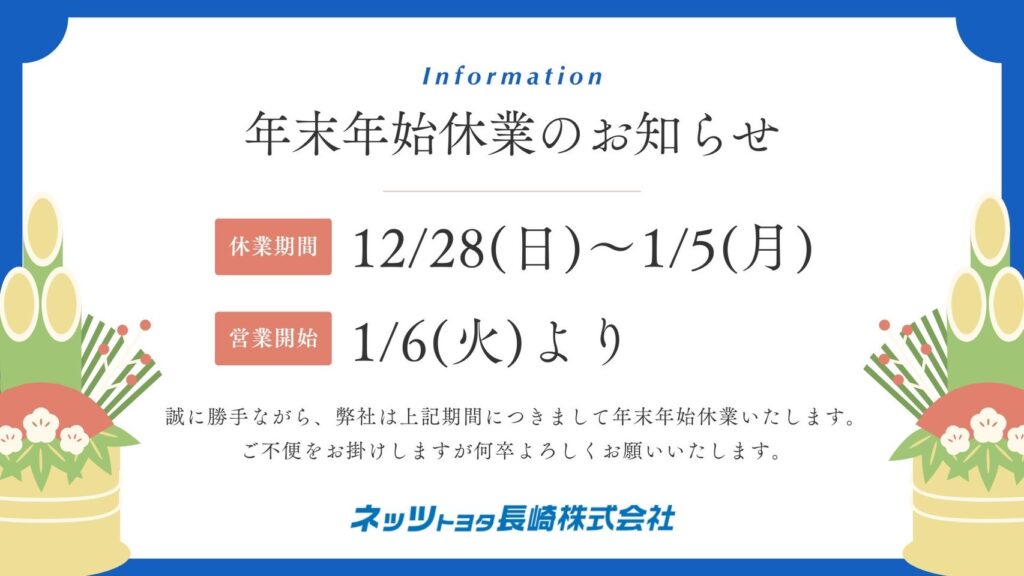 平素よりご愛顧いただき誠にありがとうございます。誠に勝手ながら、ネッツトヨタ長崎株式会社は上記期間につきまして、年末年始休業いたします。ご不便をお掛けしますが何卒よろしくお願いいたします。