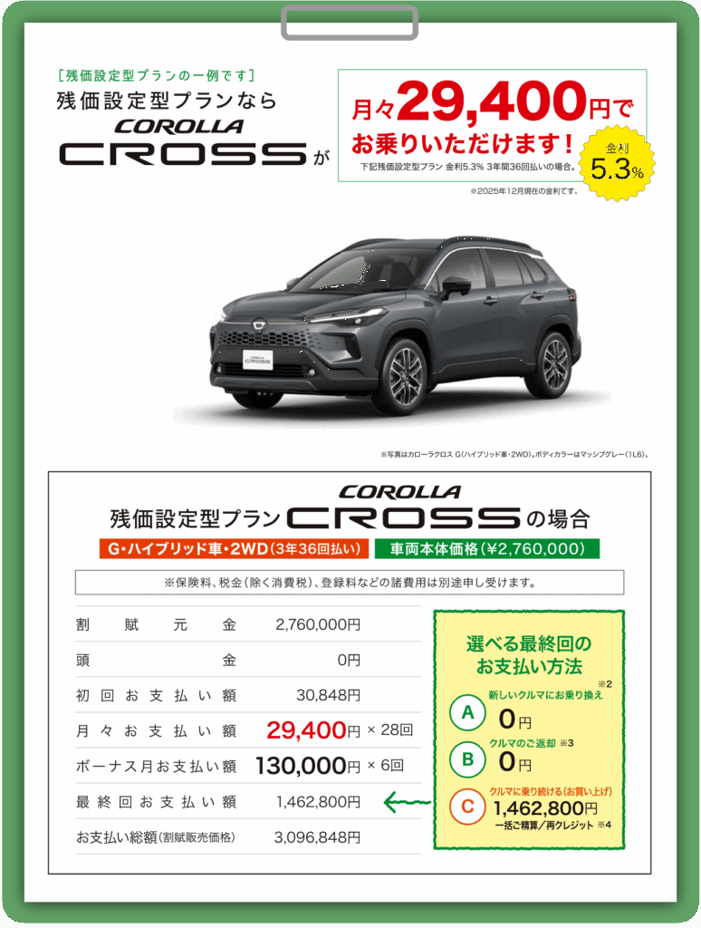 毎月のお支払い金額を軽くすることができ、最終回の選択は3つの返済方法からお選びいただけます。もちろん、そのまま乗り続けることも可能です。