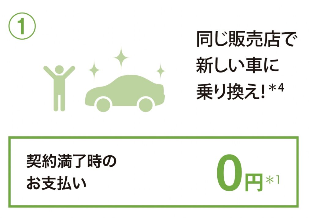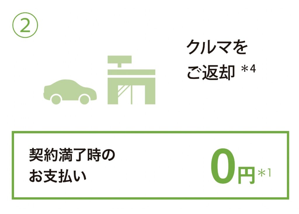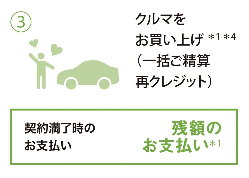 *3 ご購入いただいた販売店に車両をご返却の上、新車にお乗り換えの場合、 及び、ご購入いただいた販売店に車両をご返却の場合、最終回のお支払いは不要ですが、車両状態が事前に定めた規定外である場合は別途精算金をいただきます。